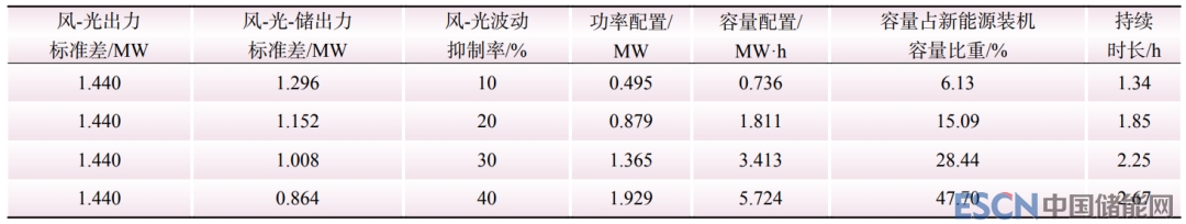 隨著風(fēng)光出力波動抑制率要求的提高,儲能的功率、容量配置以及持續(xù)時長將快速增長。將風(fēng)光出力的標(biāo)準(zhǔn)差降低10%最少需要配置0.495 MW/0.736 MW·h的儲能,儲能占新能源裝機(jī)容量占比僅為6.13%,持續(xù)時間為1.34 h;而將風(fēng)光出力的標(biāo)準(zhǔn)差降低40%,則至少需要配置1.929 MW/5.724 MW·h的儲能,儲能占新能源裝機(jī)容量占比將提升到47.7%,持續(xù)時間需要提升到2.67 h。