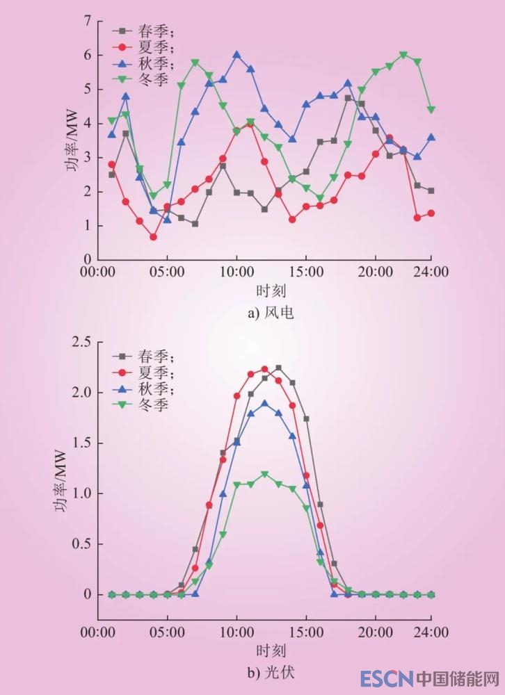 該地區(qū)的新能源由裝機(jī)容量為10 MW的風(fēng)電站和2.5 MW的光伏發(fā)電站構(gòu)成,能統(tǒng)一接入節(jié)點A。以季節(jié)變化為周期,該地區(qū)風(fēng)、光的典型日出力曲線如圖3所示。根據(jù)國家《國家發(fā)展改革委關(guān)于2021年新能源上網(wǎng)電價政策有關(guān)事項的通知》,蒙西地區(qū)風(fēng)電、光伏的上網(wǎng)電價為0.278 5元/(kW·h)。