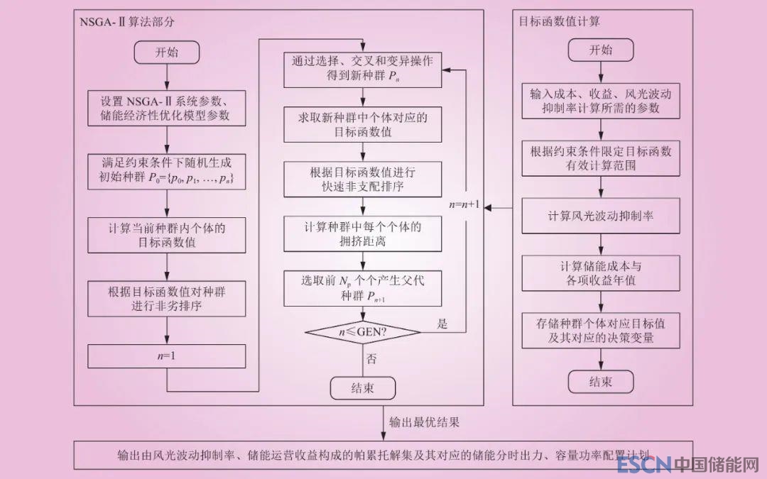 儲能技術(shù)經(jīng)濟(jì)性優(yōu)化模型為多目標(biāo)優(yōu)化問題,基于加權(quán)法和目標(biāo)規(guī)劃算法的傳統(tǒng)數(shù)學(xué)優(yōu)化方法帶有一定的主觀性,無法有效求得多目標(biāo)算法的帕累托最優(yōu)解集合。NSGA-Ⅱ是目前求解大規(guī)模多目標(biāo)優(yōu)化模型的有效算法,具有計算速度快、求解精度高、解集收斂性好、可求得帕累托最優(yōu)解集等特點[27]?;诖?,本文采用NSGA-Ⅱ算法對儲能技術(shù)經(jīng)濟(jì)性優(yōu)化模型進(jìn)行求解,算法流程圖如圖2所示。