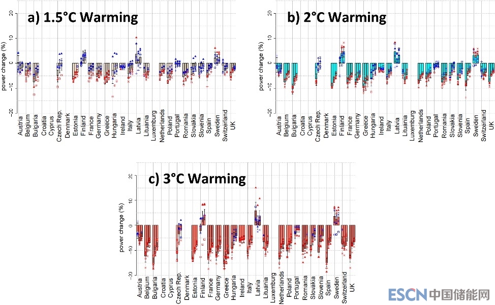 然而,現(xiàn)實中還有很多困難。法國氣候與環(huán)境科學(xué)實驗室的一項研究指出,氣候變化對歐洲大多數(shù)國家的光伏、風(fēng)力、水力和熱電發(fā)電都產(chǎn)生負面影響。研究中使用了已裝機的發(fā)電廠的數(shù)據(jù),沒有考慮發(fā)電廠的數(shù)量和空間分布在未來的變化,使用了5個區(qū)域氣候模式共同模擬,從而了解給定變暖水平下區(qū)域氣候變化的不確定性。結(jié)果顯示,在本世紀末溫升3℃的情景下,歐洲各國光伏和風(fēng)力發(fā)電的潛力降低最多可達10%,而水力和熱電發(fā)電的潛力降低最多可達20% [15]。