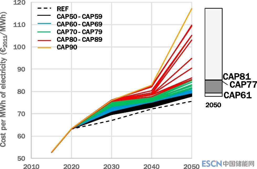 圖5 在不同減排目標下電力生產(chǎn)成本的演變 | 圖源,F(xiàn)ortes, Patrícia, et al