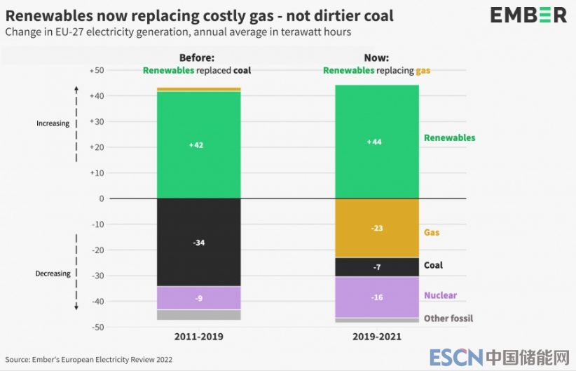 2021年下半年,由于俄烏沖突影響了歐洲天然氣的供應(yīng),天然氣價格飆升,歐盟基本上中斷了煤炭發(fā)電的淘汰進程。EMBER《歐洲電力評論2022》顯示,2011-2019年平均每年煤電量下降34太瓦時,作為補充的可再生能源發(fā)電量增加了42太瓦時,但是2021年在可再生能源發(fā)電量增加量基本穩(wěn)定的情況下,煤電量只下降了7太瓦時,而天然氣發(fā)電量減少了23太瓦時 [6]。也就是說2021年,歐盟新增的可再生能源發(fā)電量取代的是短缺的天然氣發(fā)電,而不是煤炭發(fā)電。