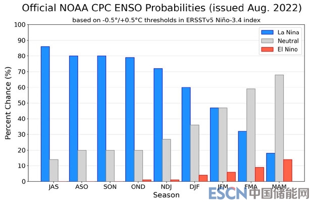圖2 美國氣候預(yù)測中心未來ENSO發(fā)生的概率預(yù)報,藍色柱表示“拉尼娜”事件發(fā)生概率,紅色柱表示“厄爾尼諾”事件發(fā)生概率,灰色柱表示中性年發(fā)生概率 | 圖源:美國國家大氣與海洋管理局
