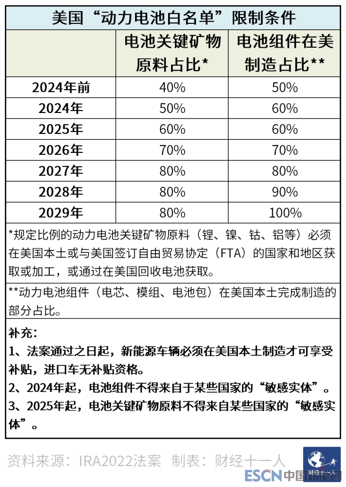 該法案中對(duì)中國企業(yè)影響最大的是對(duì)清潔能源汽車補(bǔ)貼設(shè)置了動(dòng)力電池限制條款,該條款與中國在2015年-2019年執(zhí)行的《汽車動(dòng)力蓄電池行業(yè)規(guī)范條件》,即“動(dòng)力電池白名單”頗為相似,因此也被稱為美國版“動(dòng)力電池白名單”。