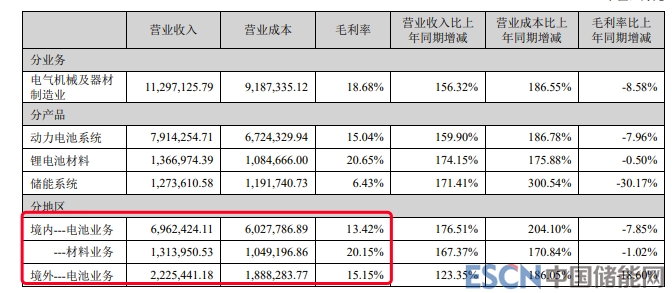 從寧德時代發(fā)布的財報來看,2022年上半年其境外電池業(yè)務(wù)的收入規(guī)模雖不及境內(nèi),但毛利率水平卻優(yōu)于境內(nèi)。財報顯示,寧德時代2022年上半年境外電池業(yè)務(wù)營業(yè)收入約為222.54億元,同比增長123.35%,毛利率為15.15%;境內(nèi)電池業(yè)務(wù)營業(yè)收入約為696.24億元,同比增長176.51%,毛利率為13.42%。