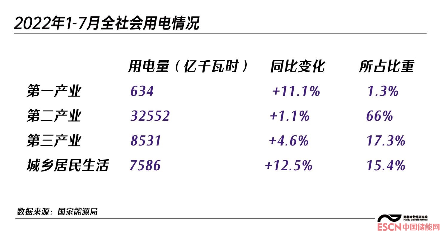 據(jù)中電聯(lián)數(shù)據(jù),2022年1至7月,全國(guó)產(chǎn)業(yè)用電共41717億千瓦時(shí),同比上漲1.1%,城鄉(xiāng)居民共用電7586億千瓦時(shí),占全社會(huì)用電量的15.4%。在產(chǎn)業(yè)用電中,以制造業(yè)、采礦業(yè)、建筑業(yè)等為主的第二產(chǎn)業(yè)是用電主力,共計(jì)用電32552億千瓦時(shí),占第一、第二、第三產(chǎn)業(yè)總用電量的78.0%。