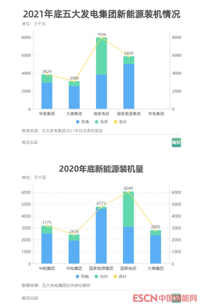 第一,五大發(fā)電集團(tuán)風(fēng)電、光伏合計(jì)新增裝機(jī)量普遍較2020年有了大幅提升。