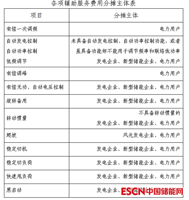 4.用戶側(cè)分?jǐn)偙壤@著增加。原則上,為了保障電網(wǎng)總體安全的頻率、電壓、備用、轉(zhuǎn)動慣量、穩(wěn)定切機、快速甩負(fù)荷、黑啟動等項目由發(fā)電企業(yè)、新型儲能企業(yè)、電力用戶共同承擔(dān);已經(jīng)提供該分項無償、有償輔助服務(wù)或參與該分項并網(wǎng)運行考核的,不重復(fù)承擔(dān)相應(yīng)輔助服務(wù)費用;為特定主體提供的輔助服務(wù)由特定主體承擔(dān),如下表所示。相對于以往電源側(cè)“零和游戲”的方式,由于有償一次調(diào)頻、自動發(fā)電控制、有償調(diào)峰、轉(zhuǎn)動慣量等輔助服務(wù)品種中電力用戶(包括電網(wǎng)企業(yè)代理購電在內(nèi)的所有工商業(yè)用戶)都是分?jǐn)傊黧w,導(dǎo)致用戶側(cè)分?jǐn)偙壤^大,而兼具部分負(fù)荷特點的抽水蓄能、獨立儲能、新型儲能分?jǐn)偙壤草^大。