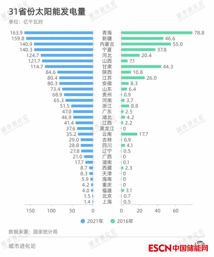 同年,太陽能發(fā)電量的前八名無一例外均被三北地區(qū)省份包攬,除青海居于第一外,新疆、內(nèi)蒙古再次進(jìn)入前三。