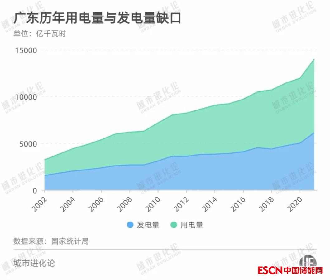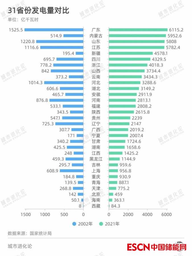 數(shù)據(jù)顯示,2002年,廣東的發(fā)電量全國第一,為1525.5億千瓦時,與云貴川三省發(fā)電量總和(1616億千瓦時)相差不大;到了2021年,廣東以6115.2億千瓦時發(fā)電量排名全國第一,而云貴川三省發(fā)電量已增至10002.8億千瓦時。