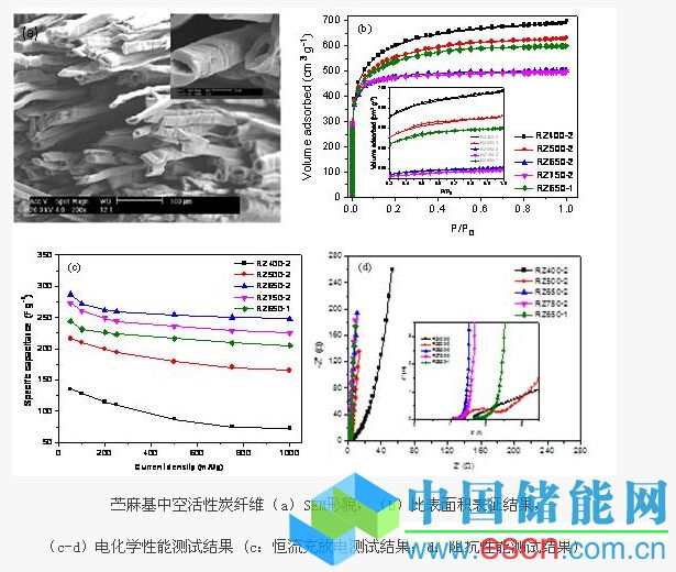 近期,過程工程所齊濤、王毅研究員帶領(lǐng)的研究團(tuán)隊(duì)發(fā)現(xiàn),采用氯化鋅作為活化劑可以在低溫下(400~650℃)對(duì)苧麻纖維進(jìn)行一步炭化活化處理。此方法可在保持原料內(nèi)部天然中空結(jié)構(gòu)的前提下,獲得比表面積超過2000m2g-1,孔容達(dá)到1.08cm3g-1的中空活性炭纖維。經(jīng)過多種電化學(xué)性能測試表明,苧麻基中空活性炭纖維具有較高的電容量(287Fg-1)和良好的電化學(xué)循環(huán)穩(wěn)定性。由于材料內(nèi)部中空的特殊結(jié)構(gòu),同時(shí)提高了電解液在材料內(nèi)部的吸附及遷移速率,顯著降低了材料的電阻。一步氯化鋅炭化活化法制備苧麻基中空活性炭纖維的方法不僅可以縮短多孔活性炭材料的生產(chǎn)周期,降低生產(chǎn)能耗,所得產(chǎn)品還具有良好的電化學(xué)儲(chǔ)能性能,因此具有較好的應(yīng)用前景。