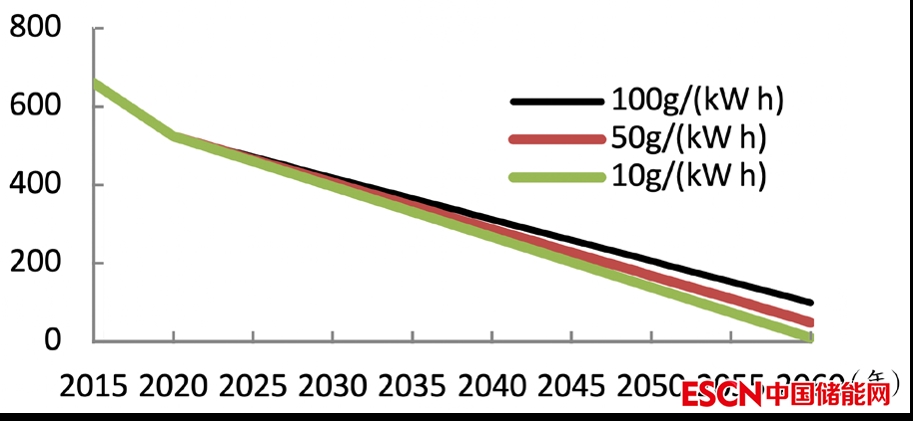 從 2020 年的 594 克/千瓦時(shí)碳排放現(xiàn)狀開始,到實(shí)現(xiàn) 2060 年 50 克/千瓦時(shí)的減排目標(biāo),意味著每 10年減少 130 多克,減排幅度也是很大的。不同排放標(biāo)準(zhǔn)下的減排預(yù)測(cè)見(圖 3)。