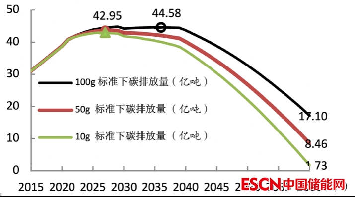 電力行業(yè)要達(dá)到“準(zhǔn)零碳排放”標(biāo)準(zhǔn),碳排放總量要比 2020 年減少 30 億噸。從發(fā)展過程來看, 50克/千瓦時(shí)的標(biāo)準(zhǔn)可以促使電力行業(yè)在 2027 年左右達(dá)峰,峰值排放量達(dá)到 42.95 億噸,如圖2。若以 100克/千瓦時(shí)的排放標(biāo)準(zhǔn),碳達(dá)峰時(shí)間大約在 2037 年,后續(xù)的碳中和目標(biāo)實(shí)現(xiàn)壓力很大。