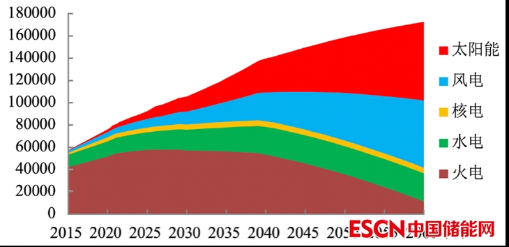 在碳達(dá)峰至碳中和期間,電力生產(chǎn)總量是增加的,年均增長(zhǎng)率 2.1%~2.3%。2015年至2060 年,全國(guó)電力生產(chǎn)總量,以及火電、水電、核電、 風(fēng)電和太陽能發(fā)電量變化趨勢(shì)如圖 1。