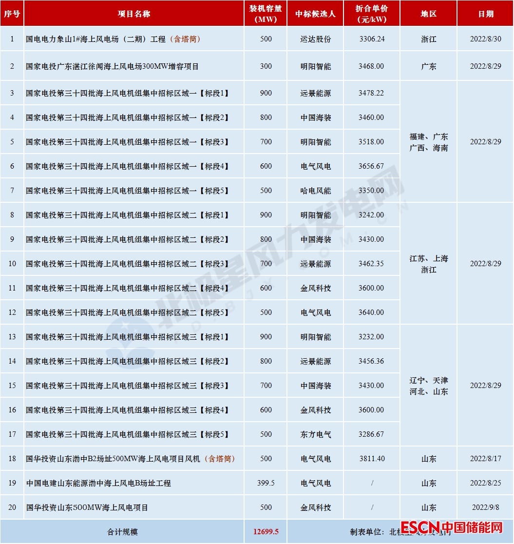 據(jù)北極星風(fēng)力發(fā)電網(wǎng)不完全統(tǒng)計,2022年8月至發(fā)文日,共計20個海上風(fēng)電項目標(biāo)段中標(biāo)公示,總裝機12699.5MW。分別為:國電電力象山1#海上風(fēng)電場(二期)工程、廣東湛江徐聞海上風(fēng)電場300MW增容項目、國家電投2022年度第三十四批集中招標(biāo)(海上風(fēng)電競配機組框架招標(biāo))、國華投資山東渤中B2場址500MW海上風(fēng)電項目、山東能源渤中海上風(fēng)電B場址工程、國華投資山東500MW海上風(fēng)電項目。