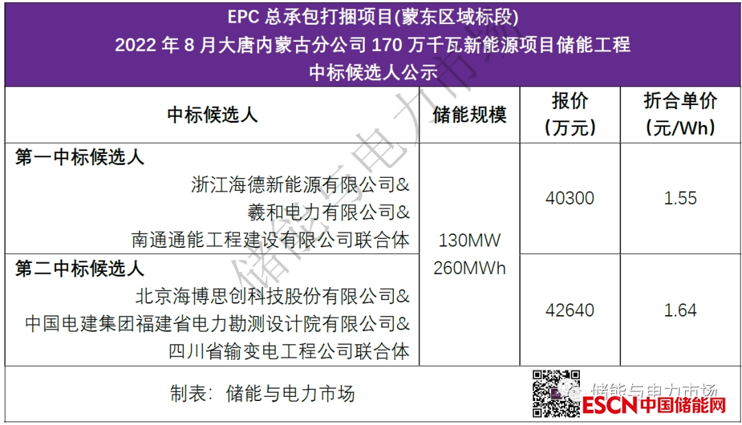 浙江海德新能源有限公司、羲和電力有限公司、南通通能工程建設(shè)有限公司組成的聯(lián)合體以總報(bào)價(jià)40300萬元,折合單價(jià)1.55元/Wh,成為第一中標(biāo)候選人。中標(biāo)結(jié)果如下表。