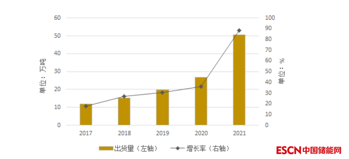 2021年,在鋰離子電池市場快速增長的帶動下,鋰離子電池負極材料出貨量大幅增長至72萬噸,同比增長94.6%,市場規(guī)模達159.1億元。此外,受全球鋰離子電池市場需求增長拉動,我國負極材料出口超15萬噸,較上年增長超1倍。業(yè)內(nèi)預計,2022年我國負極材料仍將保持大幅增長態(tài)勢,出貨量將超120萬噸。