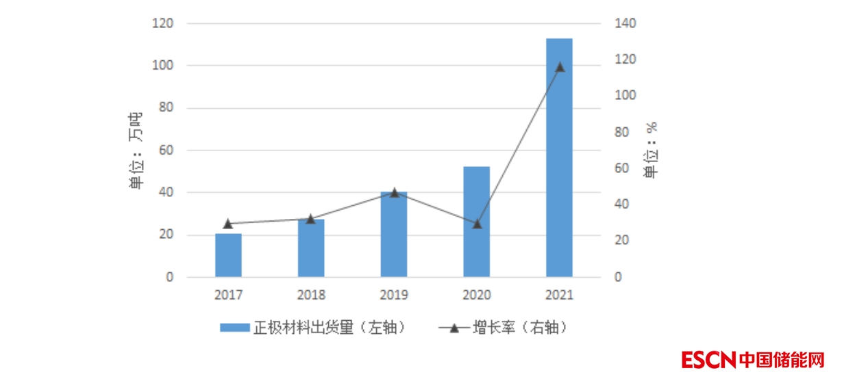 根據(jù)高工產(chǎn)業(yè)研究院(GGII)數(shù)據(jù),2021年我國鋰離子電池正極材料市場出貨量為113萬噸,同比增長116%,市場規(guī)模達877.1億元。其中,受儲能市場出貨量快速增長影響(同比增長超110%),磷酸鐵鋰正極材料出貨量達48萬噸,同比增長258%,市場占比由24%上升至43%。業(yè)內(nèi)預計,2022年我國正極材料市場規(guī)模將突破千億大關。