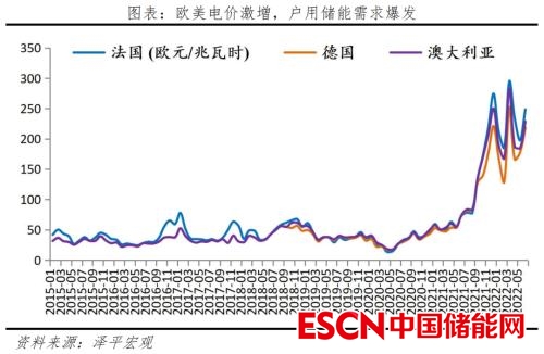 歐美戶儲場景拉動新需求,全球用戶側(cè)儲能發(fā)展?jié)摿薮蟆?020年以來,全球能源價格高漲,海外通脹高企、歐美電價大幅高增。在此背景下,居民用電成本居高不下,激化了海外戶用儲能需求爆發(fā)。根據(jù)IHS Markit數(shù)據(jù),2021年歐洲戶用儲能裝機達1717MWh,同比增長60.2%。根據(jù)美國清潔能源協(xié)會ACP數(shù)據(jù),美國在2022年上半年新增5GWh電池儲能,同比增速超30%。通過“光伏+儲能”模式,戶用儲能大幅節(jié)省海外家庭購電用電費用。中國供應(yīng)商在全球戶用儲能系統(tǒng)中的光伏組件、逆變器、電池電芯等核心環(huán)節(jié)占據(jù)重要位置。2022年1-6月,太陽能電池組件累計出口額223億美元,同比增長96%;逆變器出口31億美元,同比增長47%;鋰電池出口同比增長75%以上。