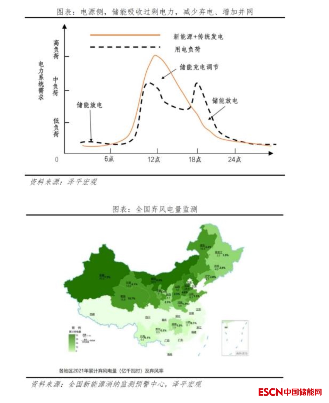 在電源側(cè),儲能系統(tǒng)將是電源調(diào)峰、削峰填谷的重要抓手,成為“清潔電量的搬運工”。未來一段時間,我國電力供應(yīng)結(jié)構(gòu)仍將以燃煤發(fā)電為主,“傳統(tǒng)+新能源”混合發(fā)電模式并行。在用電低谷時,燃煤機組可進行靈活性調(diào)節(jié),整體發(fā)電降至最小出力限制附近。但如果此時的發(fā)電供給仍高于電力需求,則傳統(tǒng)能源端無法進一步調(diào)節(jié),只能從新能源端選擇棄光、棄風(fēng)。儲能系統(tǒng)加入后,彈性調(diào)度、源網(wǎng)荷儲互動成為可能。在風(fēng)電、光伏的發(fā)電高峰時段內(nèi),儲能系統(tǒng)“充電”,消納新能源電量,有效降低棄光率;在無風(fēng)、無光時,儲能系統(tǒng)“放電”,支撐電力系統(tǒng)正常運行。