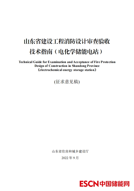 為規(guī)范和提高全省電化學(xué)儲(chǔ)能電站工程消防設(shè)計(jì)審查驗(yàn)收工作水平,保障電化學(xué)儲(chǔ)能電站工程消防質(zhì)量和安全,根據(jù)全省建設(shè)工程消防審驗(yàn)工作計(jì)劃安排,省住房城鄉(xiāng)建設(shè)廳組織有關(guān)單位和專家編制完成了《山東省建設(shè)工程消防設(shè)計(jì)審查驗(yàn)收技術(shù)指南(電化學(xué)儲(chǔ)能電站)》(征求意見稿),現(xiàn)發(fā)你們征求意見,請于2022年9月19日前將意見建議報(bào)送至省建設(shè)工程消防技術(shù)服務(wù)中心。