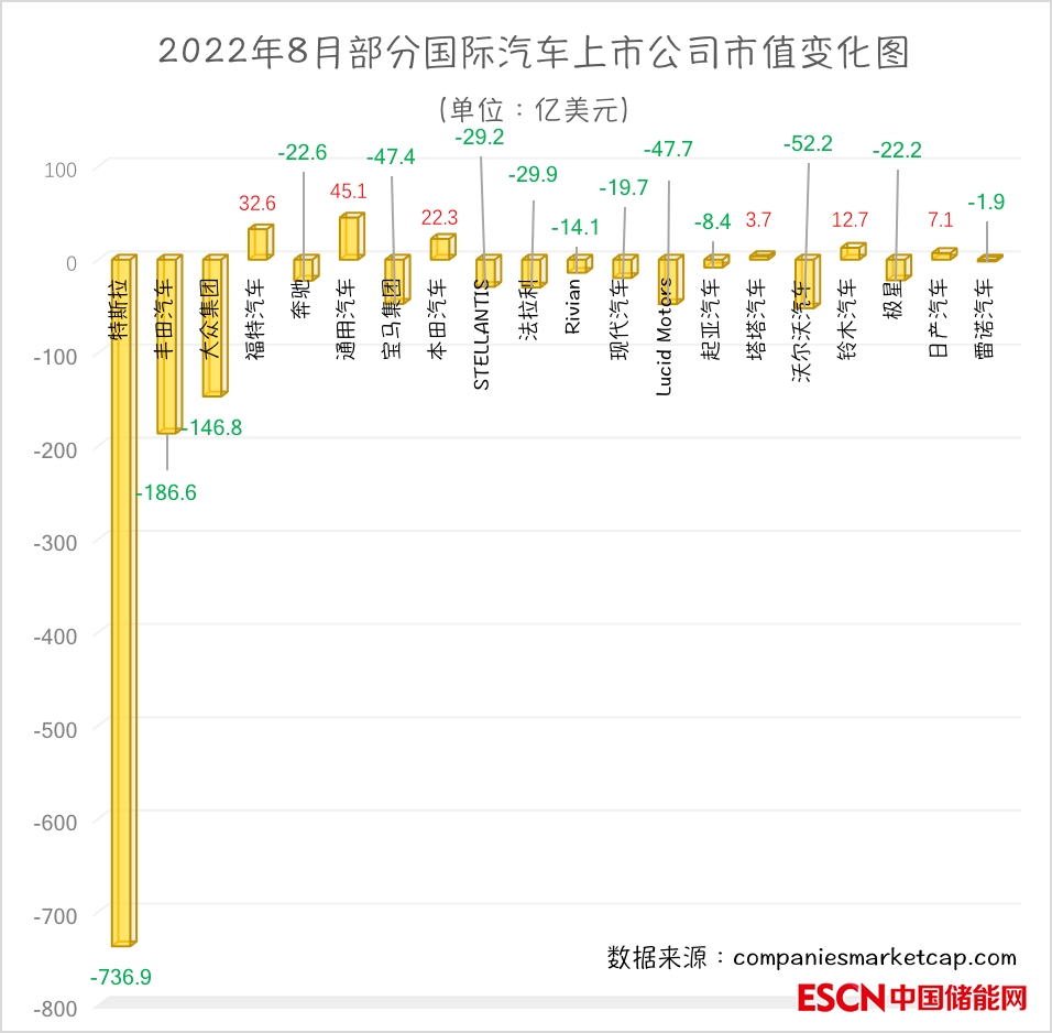 不過(guò),福特汽車(F,股價(jià)14.74美元,市值592.6億美元)、通用汽車(GM,股價(jià)40.53美元,市值590.9億美元)等車企在8月實(shí)現(xiàn)了市值增長(zhǎng),其背后原因與美國(guó)相關(guān)部門在8月中旬簽署了《通脹削減法案》有關(guān)。根據(jù)《通脹削減法案》,在北美生產(chǎn)和組裝的新能源汽車可以獲得補(bǔ)貼,因而,通用汽車和福特汽車成為該法案的贏家。