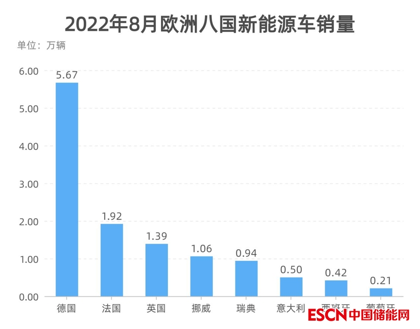 公開(kāi)資料顯示,8月,德國(guó)、法國(guó)、挪威、英國(guó)、瑞典、意大利、西班牙、葡萄牙等八國(guó)純電動(dòng)車銷量分別為5.67萬(wàn)輛、1.92萬(wàn)輛、1.06萬(wàn)輛、1.92萬(wàn)輛、0.94萬(wàn)輛、0.50萬(wàn)輛、0.42萬(wàn)輛和0.21萬(wàn)輛,合計(jì)銷量約為12.27萬(wàn)輛,同比小幅增長(zhǎng)1.5%,環(huán)比下滑1.2%。
