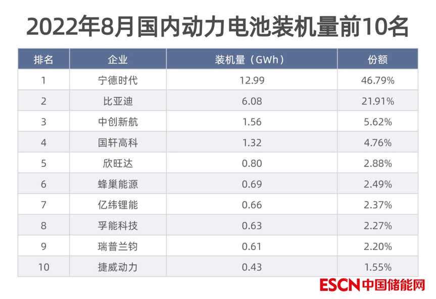 具體到動(dòng)力電池供應(yīng)商來(lái)看,8月,我國(guó)動(dòng)力電池裝車量排名前三的企業(yè)仍然是寧德時(shí)代、比亞迪和中創(chuàng)新航,三者共搶占了近四分之三的市場(chǎng)份額。