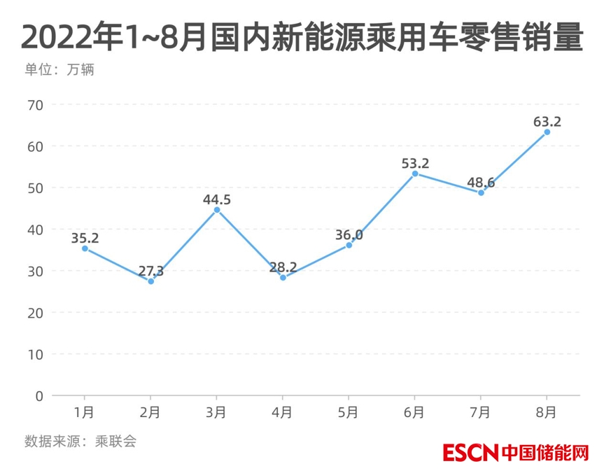 據(jù)乘聯(lián)會(huì)數(shù)據(jù),8月國(guó)內(nèi)新能源乘用車零售銷量為63.2萬(wàn)輛,同比增長(zhǎng)103.9%,環(huán)比增長(zhǎng)12%,再創(chuàng)歷史新高;1~8月,國(guó)內(nèi)新能源乘用車?yán)塾?jì)零售326.2萬(wàn)輛,同比增長(zhǎng)119.7%,整體走勢(shì)持續(xù)向上。