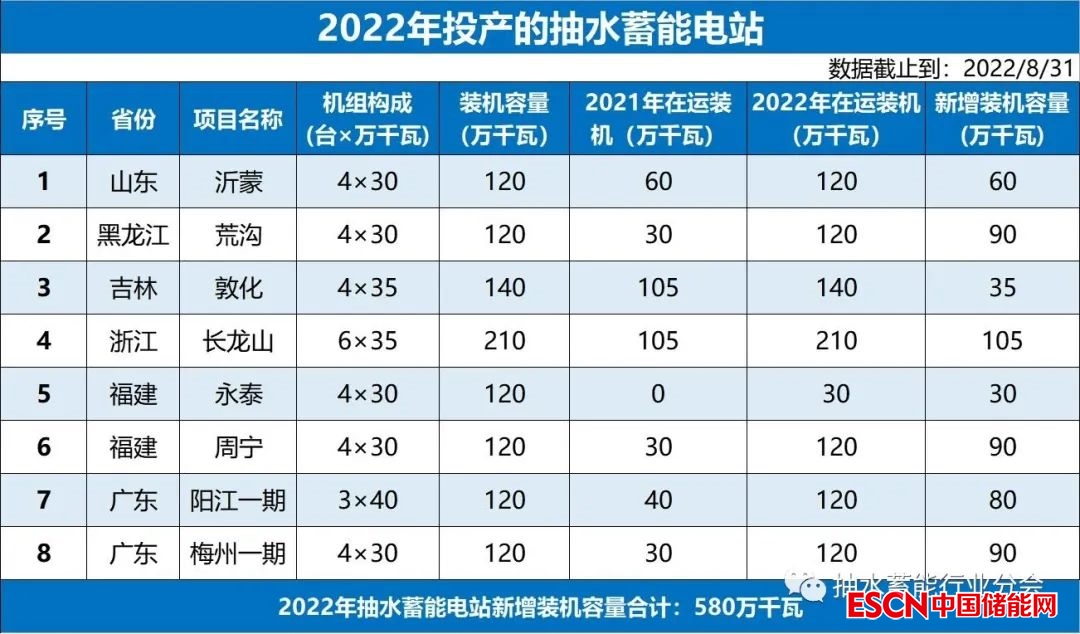 中國儲能網(wǎng)訊:2022年,我國抽水蓄能電站進展順利。截至 2022 年 8 月底,我國抽水蓄能新增投產(chǎn) 580 萬千瓦,在運裝機規(guī)模達到 4219 萬千瓦。新增投產(chǎn)項目情況詳見下表(根據(jù)公開資料整理):