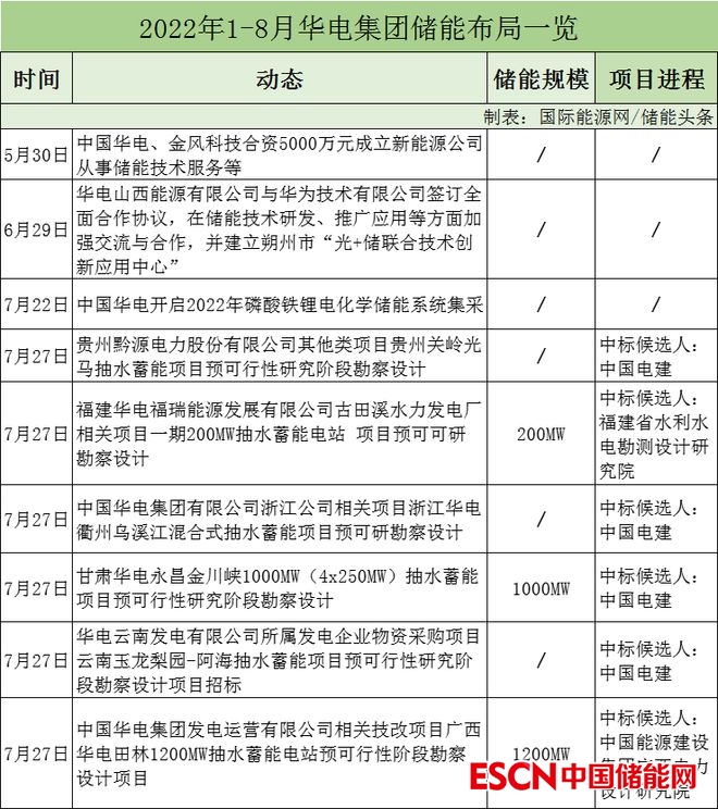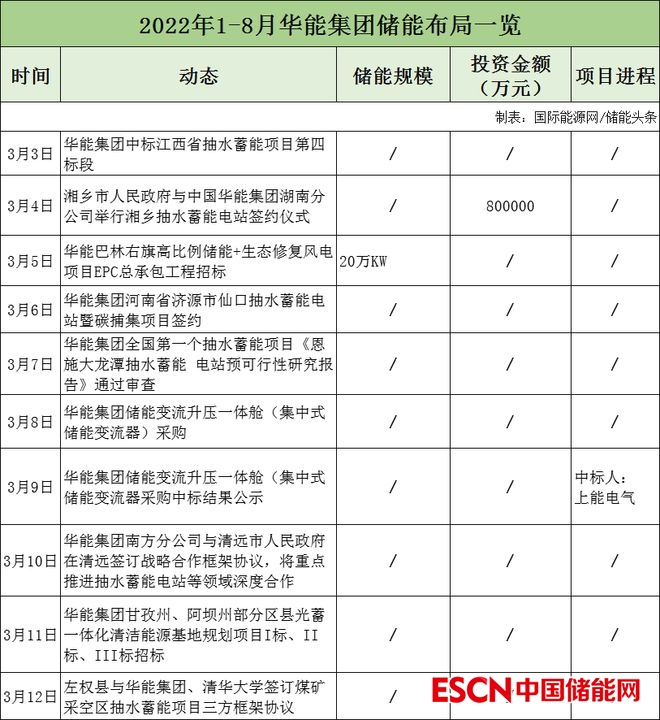 2022年,華能集團全國第一個抽水蓄能項目《恩施大龍?zhí)冻樗钅茈娬绢A可行性研究報告》通過審查;與湘鄉(xiāng)市、左權(quán)縣等地簽訂抽水蓄能項目合作協(xié)議,儲能項目招標4個,涉及儲能變流器、光蓄一體化等方面。