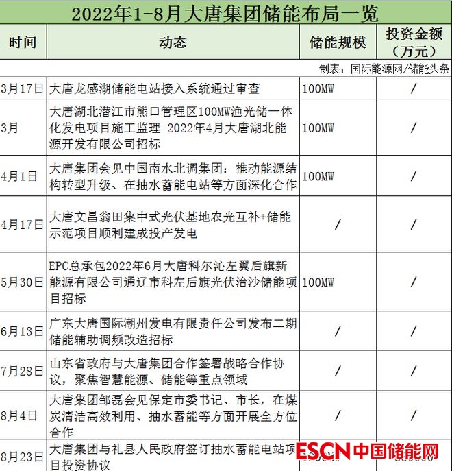 據(jù)不完全統(tǒng)計,2022年1-8月,大唐集團儲能項目招標3個,與山東、保定、南水北調(diào)集團等簽訂合作協(xié)議,涉及抽水蓄能、智慧能源等領(lǐng)域。