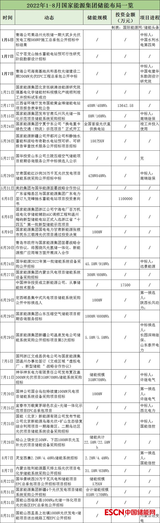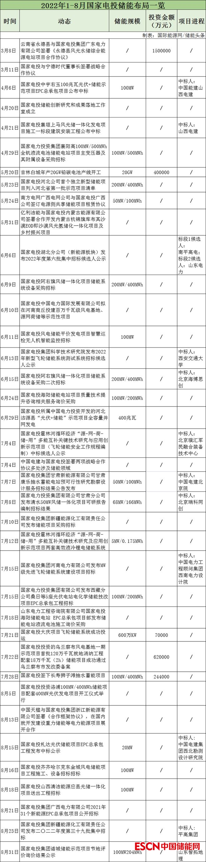 據(jù)不完全統(tǒng)計,2022年1-8月,國家電投與寧德時代、中國電建、中國天楹等簽訂合作協(xié)議,圍繞儲能材料、風光氫儲、重力儲能等方面進行合作。儲能項目招標26個,涉及飛輪儲能、液流電池、鉛炭電池、抽水蓄能及智慧新能源等方面。
