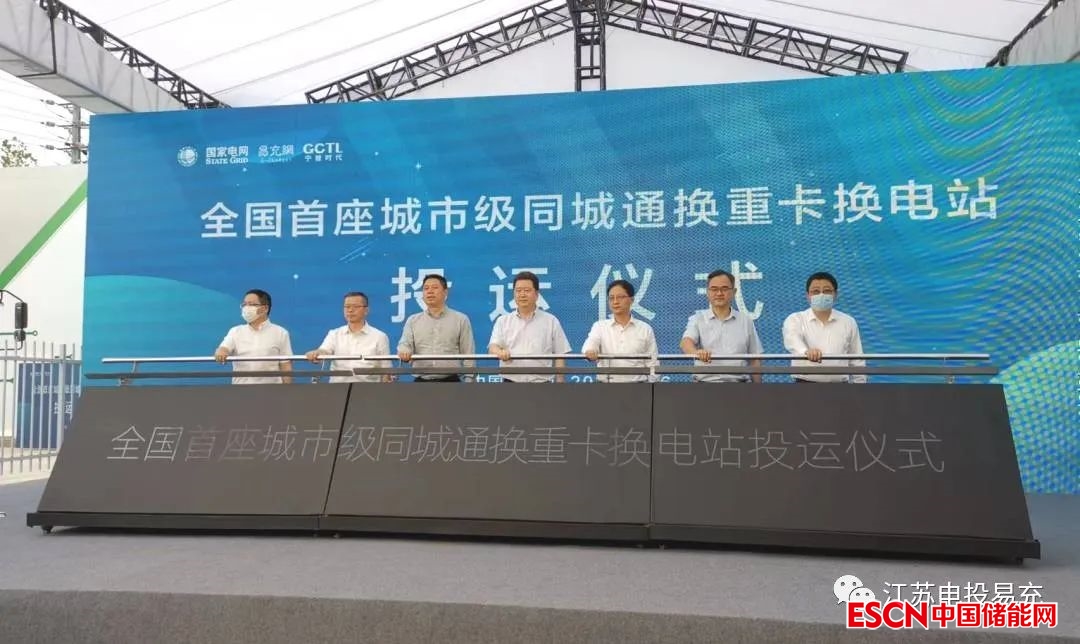 中國儲能網(wǎng)訊:2022年9月16日下午,全國首批“同城通換”重卡換電站投運儀式在南京市棲霞區(qū)普洛斯龍?zhí)吨乜〒Q電站內(nèi)隆重舉行,本次投運儀式由國網(wǎng)江蘇電動汽車服務有限公司、江蘇電投易充新能源科技有限公司、寧普易充(江蘇)新能源科技有限公司聯(lián)合主辦。來自國家、省、市政府主管部門、行業(yè)權威專家與研究機構、換電生態(tài)企業(yè)等代表約100人出席了此次活動。