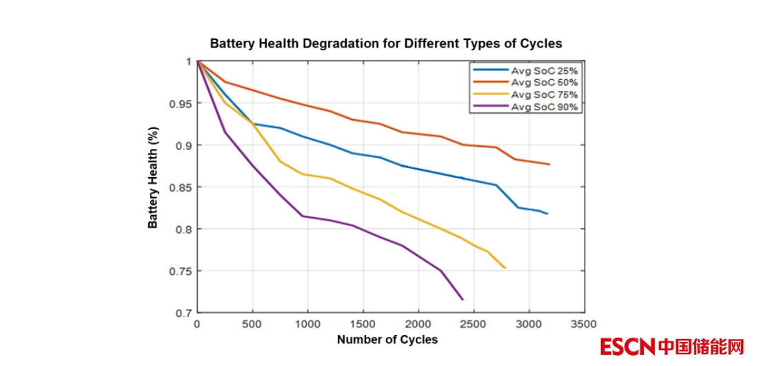 平均SoC為25%的藍(lán)色曲線表示電池在30%和20%的SoC之間持續(xù)充放電。
