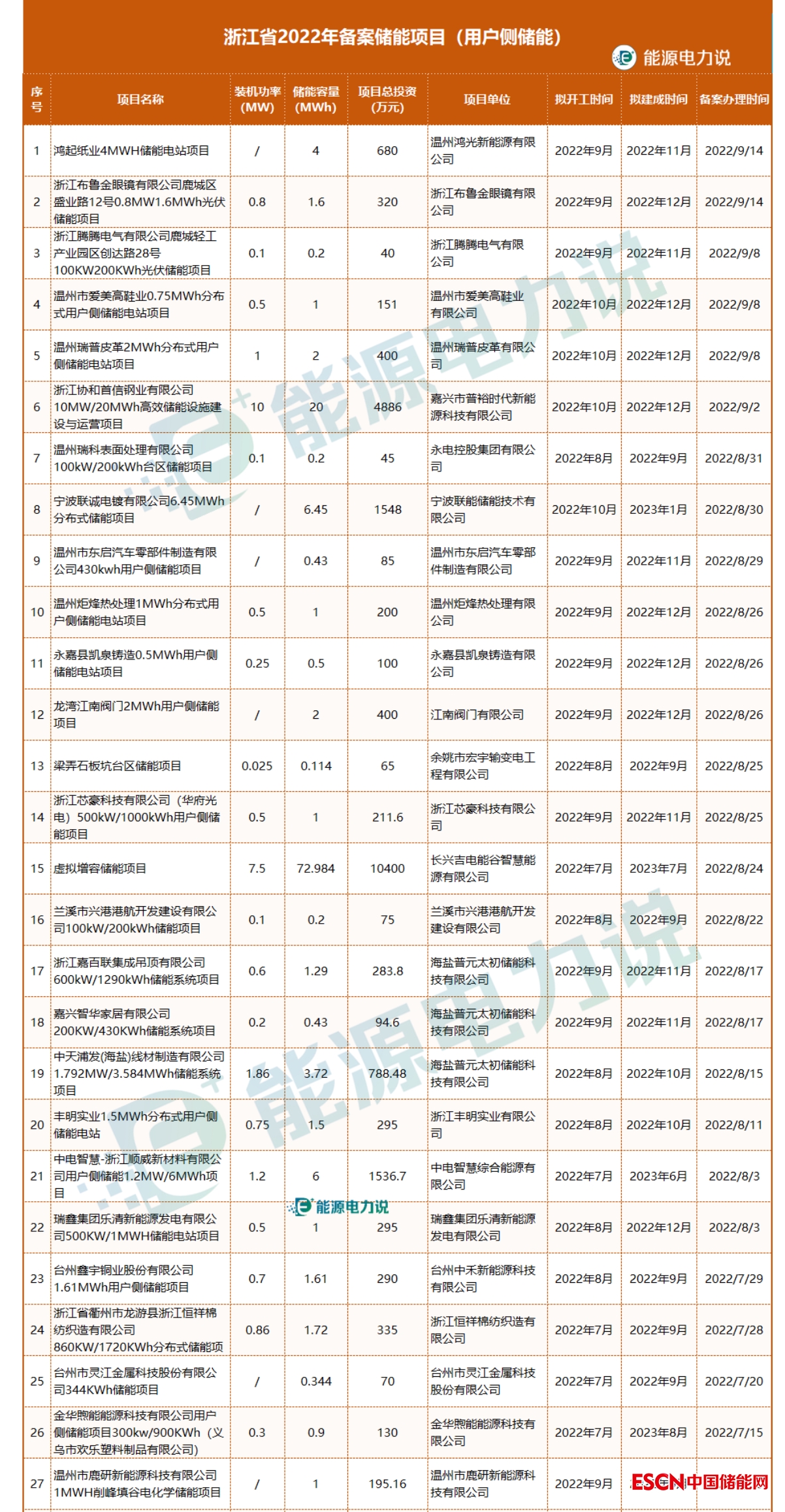 能源電力說根據(jù)浙江省公開數(shù)據(jù),統(tǒng)計(jì)了省內(nèi)已備案儲(chǔ)能項(xiàng)目情況。截止2022年9月15日,浙江省已備案獨(dú)立儲(chǔ)能、電源側(cè)/電網(wǎng)側(cè)/用戶側(cè)儲(chǔ)能項(xiàng)目152個(gè),總?cè)萘考s12GWh,涉及總投資金額約383億元。