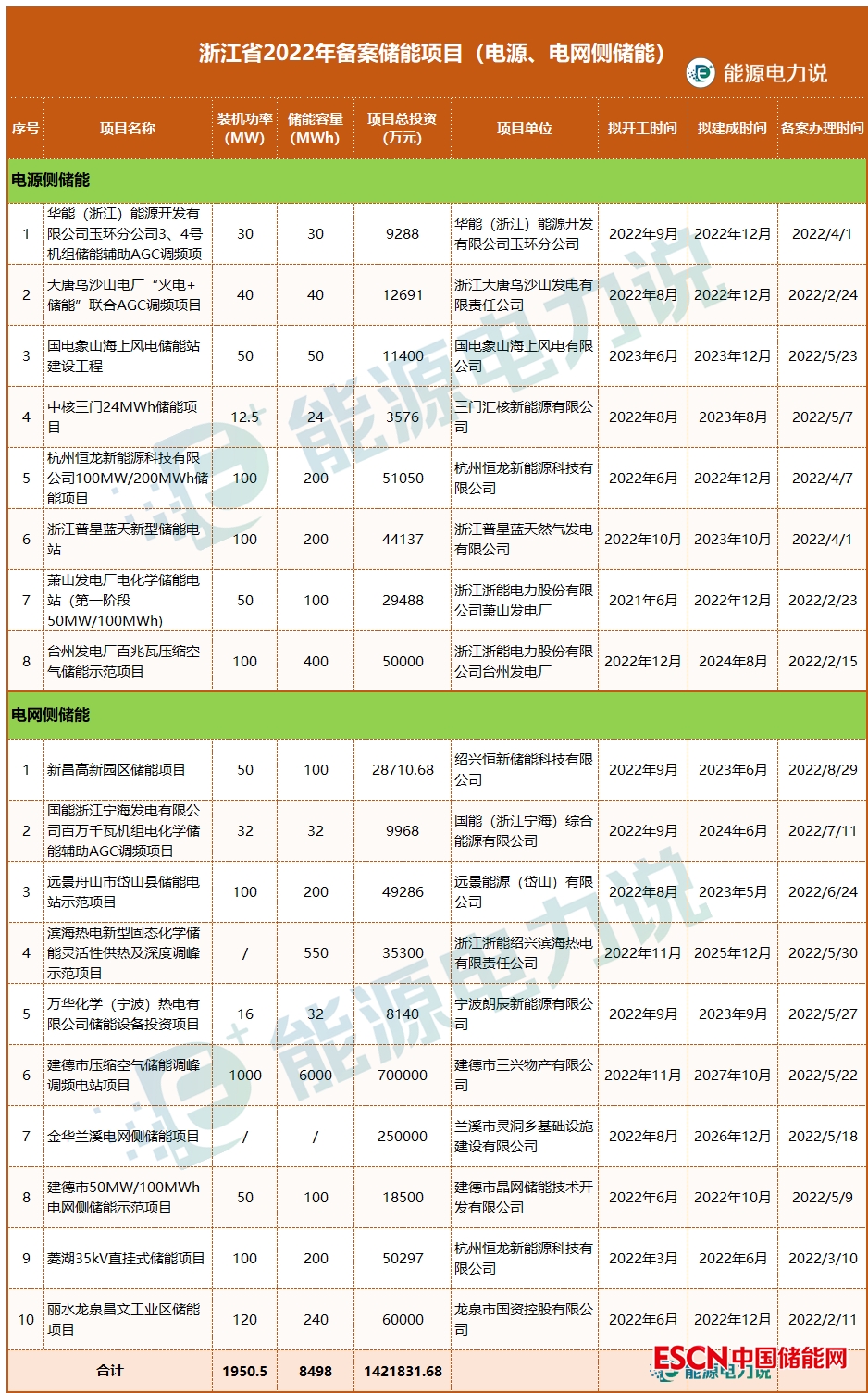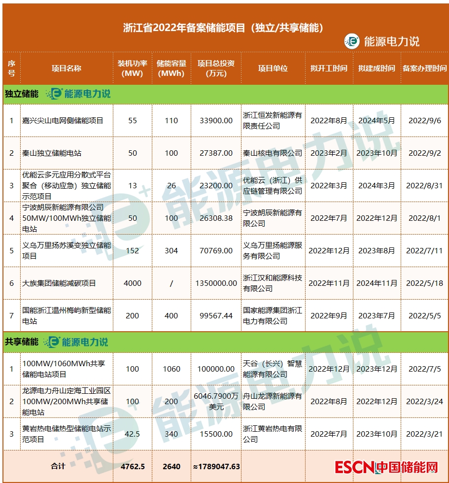 在已備案的152個(gè)儲(chǔ)能項(xiàng)目中,獨(dú)立儲(chǔ)能項(xiàng)目7個(gè),總規(guī)模約4.5GW,總投資金額約163.1億元;共享儲(chǔ)能項(xiàng)目3個(gè),總?cè)萘考s1.6GWh,總投資金額約15.8億元。建設(shè)單位包括國(guó)家能源集團(tuán)、中核電、龍?jiān)吹认聦俟荆约皟?yōu)能云(浙江)供應(yīng)鏈管理有限公司、浙江漢和能源科技有限公司、天谷(長(zhǎng)興)智慧能源有限公司等公司。