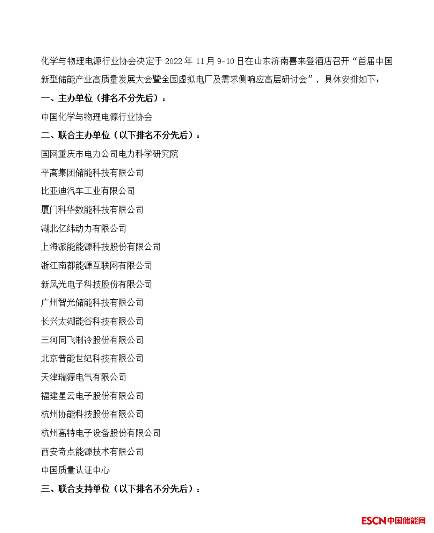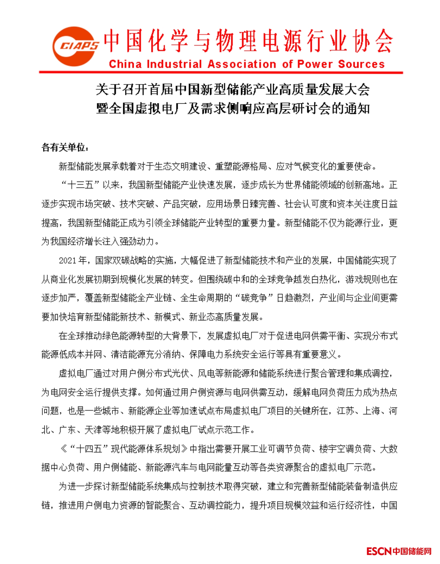 為進一步探討新型儲能系統(tǒng)集成與控制技術取得突破,建立和完善新型儲能裝備制造供應鏈,推進用戶側(cè)電力資源的智能聚合、互動調(diào)控能力,提升項目規(guī)模效益和運行經(jīng)濟性,中國化學與物理電源行業(yè)協(xié)會決定于2022年11月9-10日在山東濟南喜來登酒店召開“首屆中國新型儲能產(chǎn)業(yè)高質(zhì)量發(fā)展大會暨全國虛擬電廠及需求側(cè)響應高層研討會”,具體安排如下: