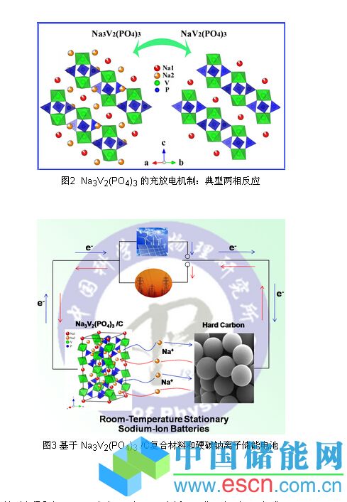 最近中國科學(xué)院物理研究所/北京凝聚態(tài)物理國家實驗室(籌)清潔能源實驗室E01組胡勇勝研究員和武漢理工大學(xué)陳文教授聯(lián)合培養(yǎng)的博士生簡澤浪等開發(fā)出一種新型Na3V2(PO4)3/C復(fù)合材料。作為鈉離子電池正極時,充放電平臺在3.4 V左右(如圖1所示),其儲鈉平均電壓高于目前報道的鈉離子電池正極材料。 Na3V2(PO4)3/C復(fù)合材料的可逆容量達(dá)到100 mAh/g以上,接近其理論容量(117 mAh/g),首周庫侖效率高達(dá)98%。原位XRD研究表明,該材料儲鈉機(jī)制為一典型的兩相( Na3V2(PO4)3 和NaV2(PO4)3)反應(yīng)(如圖2所示),其充放電過程中體積形變較小,約為8.3%。具有NASICON結(jié)構(gòu)的 Na3V2(PO4)3 (其中2個Na占據(jù)晶格中18e位置,1個Na占據(jù)6b位置)材料結(jié)構(gòu)穩(wěn)定,Na+離子在脫嵌過程中,主體結(jié)構(gòu)保持不變,循環(huán)穩(wěn)定,適合作為長壽命鈉離子儲能電池的正極材料,可以和硬碳等負(fù)極材料構(gòu)建室溫鈉離子電池(如圖3所示)。該工作發(fā)表在Electrochemistry Communications, 2012, 14: 86-89上,為該雜志過去90天內(nèi)下載量排前15名論文之一(http://www.journals.elsevier.com/electrochemistry-communications/most-read-articles/)。已申請了系列發(fā)明專利。相關(guān)工作得到了Advances In Engineering網(wǎng)站的報道。