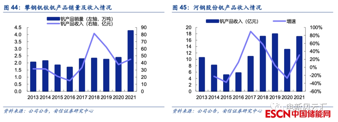 全釩液流電池儲能發(fā)展有望明顯拉動上游釩資源需求,建議關(guān)注攀鋼釩鈦、河鋼股份等產(chǎn)能領(lǐng)先的釩資源企業(yè)。在傳統(tǒng)鋼鐵領(lǐng)域需求趨緩甚至萎縮的情況下,我們認為國內(nèi)豐富的釩資源儲量決定了釩價難以出現(xiàn)持續(xù)性、大幅度的上漲,但相關(guān)釩資源企業(yè)仍有望受益儲能領(lǐng)域新需求的逐步放量,未來釩產(chǎn)品產(chǎn)銷量有望隨全釩液流電池儲能市場發(fā)展而同步增長。