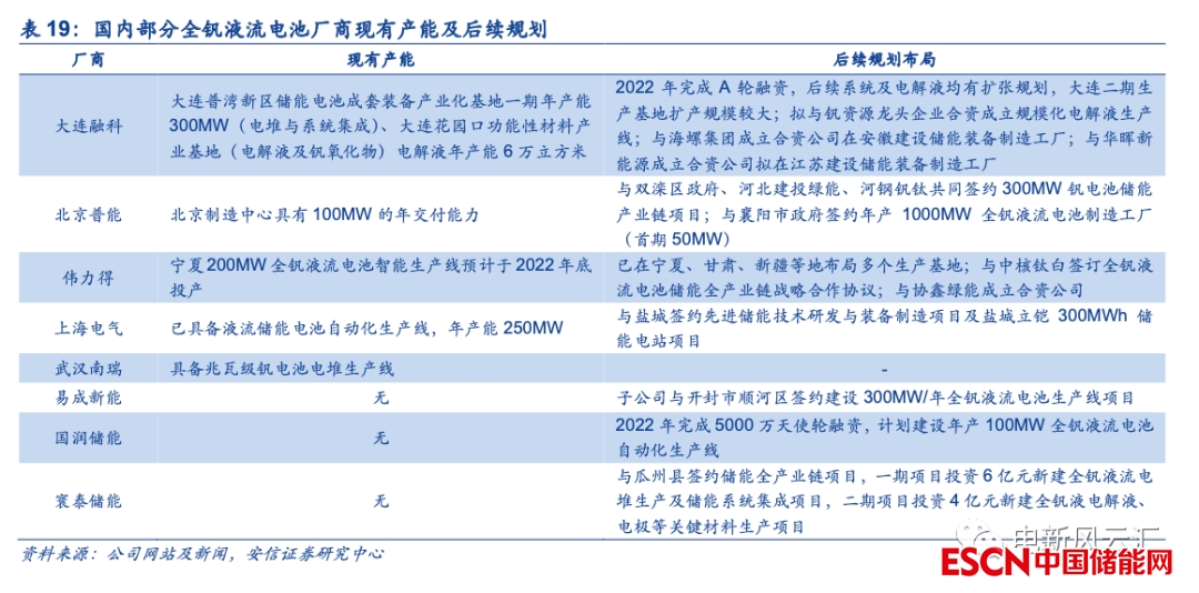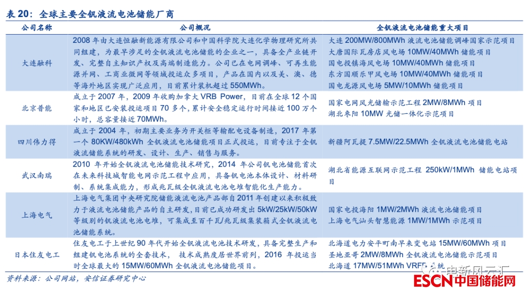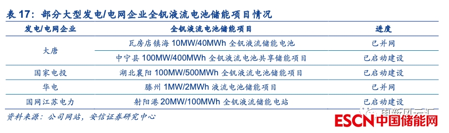短期內(nèi)全釩液流電池的主要應(yīng)用場景為大規(guī)模電網(wǎng)側(cè)/發(fā)電側(cè)項目,投資主體為大型發(fā)電/電網(wǎng)企業(yè)??紤]到當(dāng)前國內(nèi)儲能最重要的驅(qū)動因素為新能源發(fā)電側(cè)的強制配套要求,且全釩液流電池自身的初始投資成本相對較高,我們預(yù)計短期內(nèi)全釩液流電池儲能項目的投資將主要由大型發(fā)電企業(yè)或電網(wǎng)企業(yè)主導(dǎo)。目前大唐、國家電投、中廣核等大型電力集團已經(jīng)啟動了百MWh級別的全釩液流電池儲能項目建設(shè),華電、國網(wǎng)江蘇等亦在進行示范性項目的嘗試,經(jīng)過前期項目的驗證,未來全釩液流電池有望成為大型電力集團重點布局的一類儲能形式。