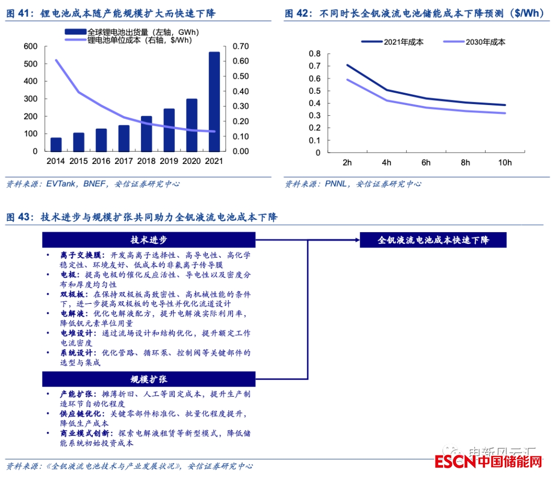 產(chǎn)業(yè)化進程加速有望助力全釩液流電池成本持續(xù)下降?;仡欙L(fēng)電、光伏、鋰電等新能源產(chǎn)業(yè)的發(fā)展歷程,產(chǎn)能擴大帶來的規(guī)模效應(yīng)是成本下降的重要驅(qū)動因素。此前較低的產(chǎn)業(yè)化程度嚴重制約了全釩液流電池成本下降的速度,未來隨著產(chǎn)能的快速擴張,無論是供應(yīng)鏈還是生產(chǎn)制造環(huán)節(jié)均有望實現(xiàn)成本的快速攤薄,行業(yè)或?qū)⑦M入“產(chǎn)能擴大-成本下降-需求提升-進一步助推產(chǎn)業(yè)發(fā)展”的良性循環(huán)。根據(jù)美國太平洋西北國家實驗室(PNNL)的預(yù)測,2030年全釩液流電池的初始投資成本(100MW/4h系統(tǒng))將由2021年的500美元/kWh以上降低至420美元/kWh左右,考慮到當(dāng)前的技術(shù)進步與規(guī)模擴張速度,我們認為實際的降本速度有望更快。