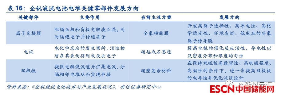 現(xiàn)階段全釩液流電池電堆關(guān)鍵部件以廠商自產(chǎn)或定制為主,后續(xù)技術(shù)進步以及規(guī)?;慨a(chǎn)將帶動成本持續(xù)下行。相較于資源成本主導(dǎo)的能量單元(釩占據(jù)成本大頭),我們認為功率單元未來存在較大的降本空間。一方面,關(guān)鍵部件以及系統(tǒng)設(shè)計層面的技術(shù)進步將帶動全釩液流電池電堆持續(xù)降本增效,例如開發(fā)高離子選擇性、高導(dǎo)電性、高化學(xué)穩(wěn)定性、低成本的離子交換膜,提升雙極板電導(dǎo)性,提高電極反應(yīng)活性以及導(dǎo)電性等。另一方面,現(xiàn)階段全釩液流電池產(chǎn)業(yè)整體規(guī)模有限,關(guān)鍵部件以全釩液流電池廠商自產(chǎn)或小批量定制為主,后續(xù)隨著生產(chǎn)規(guī)模的提升,整體的制造成本有望明顯攤薄。此外,從原理和構(gòu)成的角度出發(fā),全釩液流電池與氫燃料電池在關(guān)鍵材料(雙極板、離子膜、電極等)、電堆結(jié)構(gòu)以及生產(chǎn)設(shè)備等方面都存在較大的相似性,后續(xù)氫能產(chǎn)業(yè)的蓬勃發(fā)展也有望推動相關(guān)產(chǎn)業(yè)鏈環(huán)節(jié)的快速成熟。
