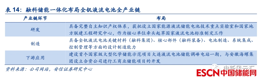 現(xiàn)階段全釩液流電池廠商一體化程度較高,產(chǎn)業(yè)鏈生態(tài)初步建立。整體來看當(dāng)前全釩液流電池儲能仍處于商業(yè)化運營初期,市場參與者相對較少,行業(yè)前期的發(fā)展很大程度上由頭部廠商進行推動。國內(nèi)對全釩液流電池的研究始于20世紀90年代初,早期主要由中國工程物理研究院、大連化學(xué)物理研究所、中南大學(xué)、清華大學(xué)等科研院所進行相應(yīng)實驗室研發(fā),其中大連化物所在國家科技部“863”計劃項目的支持下于2005年成功研制出當(dāng)時國內(nèi)規(guī)模最大的10kW全釩液流電池儲能系統(tǒng),邁出了國內(nèi)全釩液流電池儲能技術(shù)應(yīng)用的第一步。行業(yè)龍頭融科儲能于2008年成立,經(jīng)過數(shù)十年發(fā)展,公司具備從前端研發(fā)到后端項目運營的全產(chǎn)業(yè)鏈開發(fā)能力,深度參與全釩液流電池產(chǎn)業(yè)鏈各個環(huán)節(jié)。由于前期全釩液流電池技術(shù)尚未定型,且項目體量相對較小,行業(yè)呈現(xiàn)出非標(biāo)化、定制化的特點,產(chǎn)業(yè)鏈生態(tài)主要由一體化的頭部廠商主導(dǎo)。