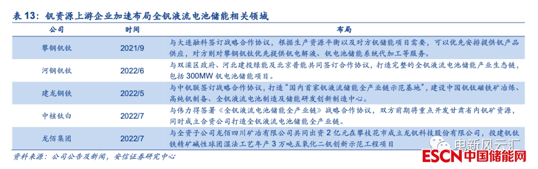 龍頭釩資源企業(yè)積極布局全釩液流電池市場。在傳統(tǒng)鋼鐵領(lǐng)域需求趨于穩(wěn)定的背景下,新興的全釩液流電池儲能市場正成為釩資源企業(yè)未來重要的潛在增長點,龍頭廠商已在相關(guān)領(lǐng)域進行了大量布局。例如攀鋼釩鈦于2021年9月公告與大連融科簽訂《戰(zhàn)略合作協(xié)議》,將根據(jù)生產(chǎn)資源平衡以及釩儲能項目需要優(yōu)先為其安排釩產(chǎn)品供應(yīng),2022年雙方已就全釩液流電池用釩儲能介質(zhì)委托加工和釩儲能介質(zhì)購銷簽訂了商業(yè)合同,預(yù)計交易金額約5億元。2022年以來河鋼、建龍、中核鈦白等上游資源廠商亦相繼與北京普能、偉力得等全釩液流電池廠商簽訂戰(zhàn)略合作協(xié)議。