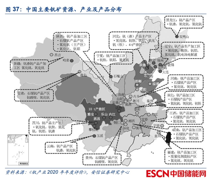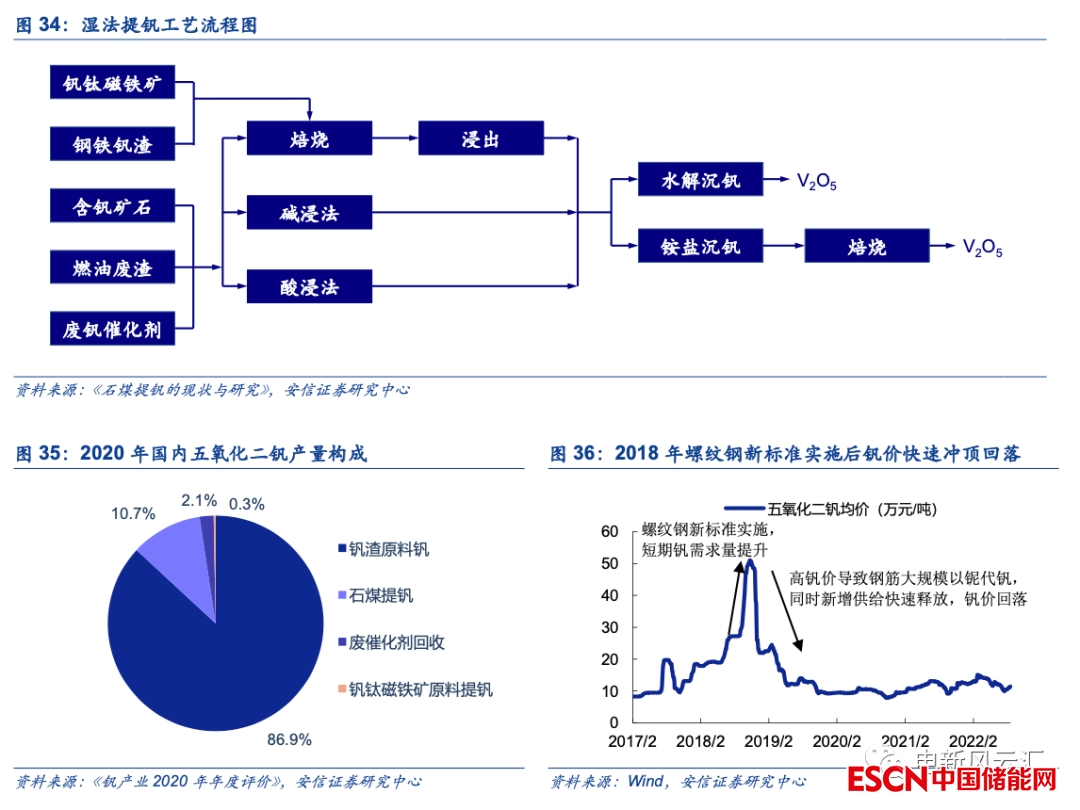 目前釩鈦磁鐵礦是主要的釩供給來源,未來石煤有望貢獻一定增量。我國釩資源主要以釩鈦磁鐵礦和含釩石煤兩種形式存在,其中石煤礦中釩的品味較低且提釩過程中污染較為嚴重,整體生產(chǎn)成本高于鋼渣提釩,目前國內(nèi)絕大多數(shù)釩產(chǎn)品來源于釩鈦磁鐵礦經(jīng)鋼鐵冶煉得到的富釩鋼渣(2020年占比超過85%)??紤]到鋼渣提釩的產(chǎn)出一定程度上取決于釩鋼產(chǎn)量,整體供給相對穩(wěn)定,我們認為隨著全釩液流電池市場需求的增加以及技術(shù)的進步,未來石煤提釩或?qū)⒇暙I一定的增量。例如2019年西部礦業(yè)在甘肅省肅北縣建設(shè)了國內(nèi)首條綠色石煤提釩環(huán)保生產(chǎn)線,一/二期已分別于2020/2022年投產(chǎn),目前可實現(xiàn)2000噸偏釩酸銨產(chǎn)能。因此,整體上看未來上游釩資源出現(xiàn)瓶頸的可能性相對較小,一方面?zhèn)鹘y(tǒng)鋼鐵領(lǐng)域的需求預(yù)計將保持穩(wěn)定甚至有所萎縮,另一方面釩資源的潛在供給來源較多,一旦釩價大幅上行(例如2018年螺紋鋼新標(biāo)準實施后),鋼鐵行業(yè)可通過加大釩鈦磁鐵礦冶煉比例快速新增供給,高成本的石煤提釩亦可釋放一定產(chǎn)能,釩價難以出現(xiàn)大幅度、持續(xù)性的上漲。