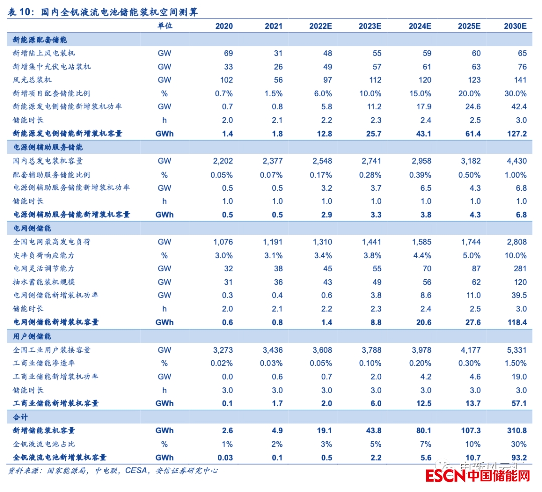 我們測算2025/2030年國內(nèi)儲能新增裝機規(guī)模有望達到107/311GWh,全釩液流電池潛在裝機空間或超10/90GWh。從結(jié)構(gòu)上來看,我們預(yù)計十四五期間新能源配套儲能將率先放量,電網(wǎng)側(cè)、用戶側(cè)儲能則將隨后大規(guī)模啟動,具體假設(shè)與測算如下。