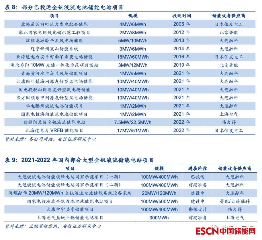 大型項目陸續(xù)啟動,全釩液流電池產(chǎn)業(yè)化進程提速。隨著全球儲能市場的爆發(fā)以及全釩液流電池技術(shù)的成熟,我們認為全釩液流電池規(guī)?;l(fā)展的節(jié)點已經(jīng)到來。此前全釩液流電池儲能仍處于小規(guī)模示范驗證階段,項目單體規(guī)?;静怀^10MW,而2021年以來國內(nèi)已有數(shù)個百MWh級別的大型全釩液流電池項目陸續(xù)啟動。2022年5月由大連融科建設(shè)的首個國家級大型化學(xué)儲能示范項目大連恒流儲能電站一期100MW/400MWh成功并網(wǎng),8月開始正式投入商業(yè)運營,我們認為后續(xù)全釩液流電池儲能的產(chǎn)業(yè)化進程將持續(xù)加快。