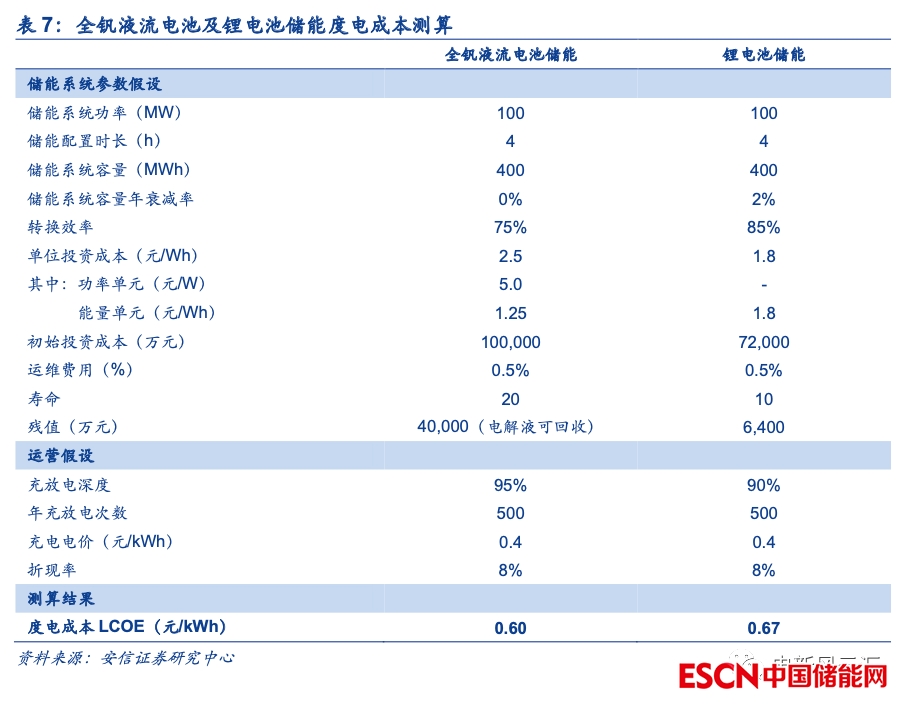 當(dāng)前4h全釩液流電池的度電成本或已低于鋰電池儲能。我們基于當(dāng)前應(yīng)用較廣的4h儲能系統(tǒng)對全釩液流電池和鋰電池儲能的度電成本進行了簡單測算,在我們的假設(shè)下,全釩液流電池的單瓦時初始投資(2.5元/Wh)高于鋰電池儲能(1.8元/Wh),但更長的壽命、更低的衰減以及更大的充放電深度使得全釩液流電池全生命周期內(nèi)的度電成本(0.60元/kWh)低于鋰離子電池儲能(0.67元/kWh)。從經(jīng)濟性角度出發(fā),我們認為當(dāng)前全釩液流電池在中長時儲能場景中已經(jīng)具備商業(yè)化應(yīng)用的基本條件。