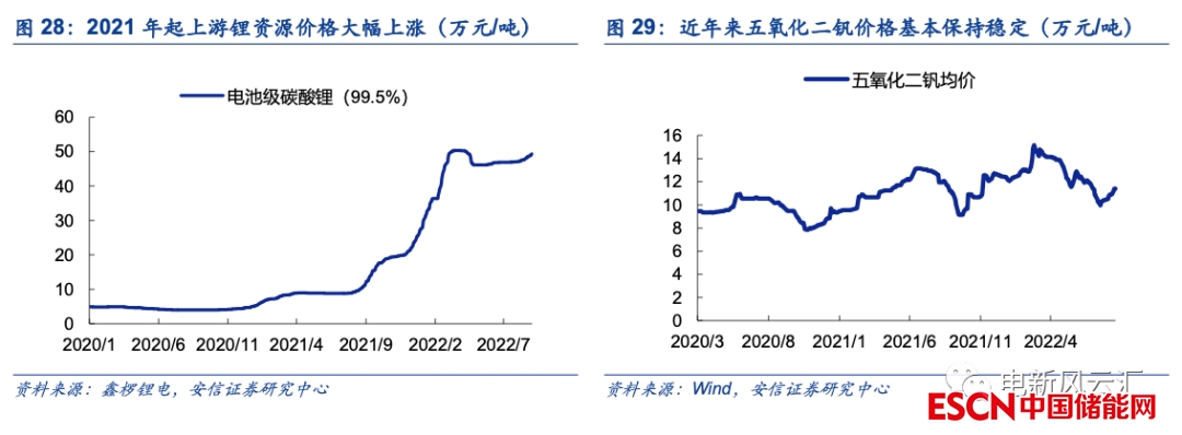 上游資源價格飆升制約鋰電降本,全釩液流電池與鋰電池儲能的經(jīng)濟性差距收窄。2021年以來,在新能車、儲能等下游市場旺盛需求的推動下,上游鋰資源的供需持續(xù)趨緊,碳酸鋰價格由2021年初的5萬元/噸左右一度飆升至50萬元/噸,鋰電產(chǎn)業(yè)鏈普遍面臨較大的原材料成本壓力,鋰電池儲能成本亦隨之明顯上行??紤]到未來新能車等儲能之外的市場對鋰資源的需求仍將保持快速增長,中短期內(nèi)鋰價或?qū)⒊掷m(xù)保持高位。相較而言,我國釩資源儲量相對豐富,且下游市場主要為鋼鐵行業(yè),需求較為穩(wěn)定,未來釩價大幅上行的可能性較小,全釩液流電池可憑借自身的技術(shù)進步持續(xù)降本增效。因此,我們認為當(dāng)前鋰電池和全釩液流電池的成本正呈“此消彼長”之勢,兩者之間的經(jīng)濟性差距正迅速縮小。